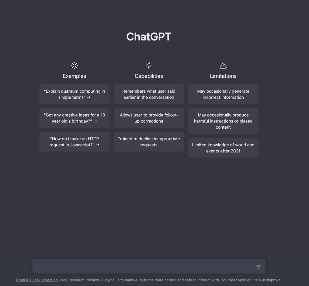 We’ve trained a model called ChatGPT which interacts in a conversational way. The dialogue format makes it possible for ChatGPT to answer followup questions, admit its mistakes, challenge incorrect premises, and reject inappropriate requests. ChatGPT is